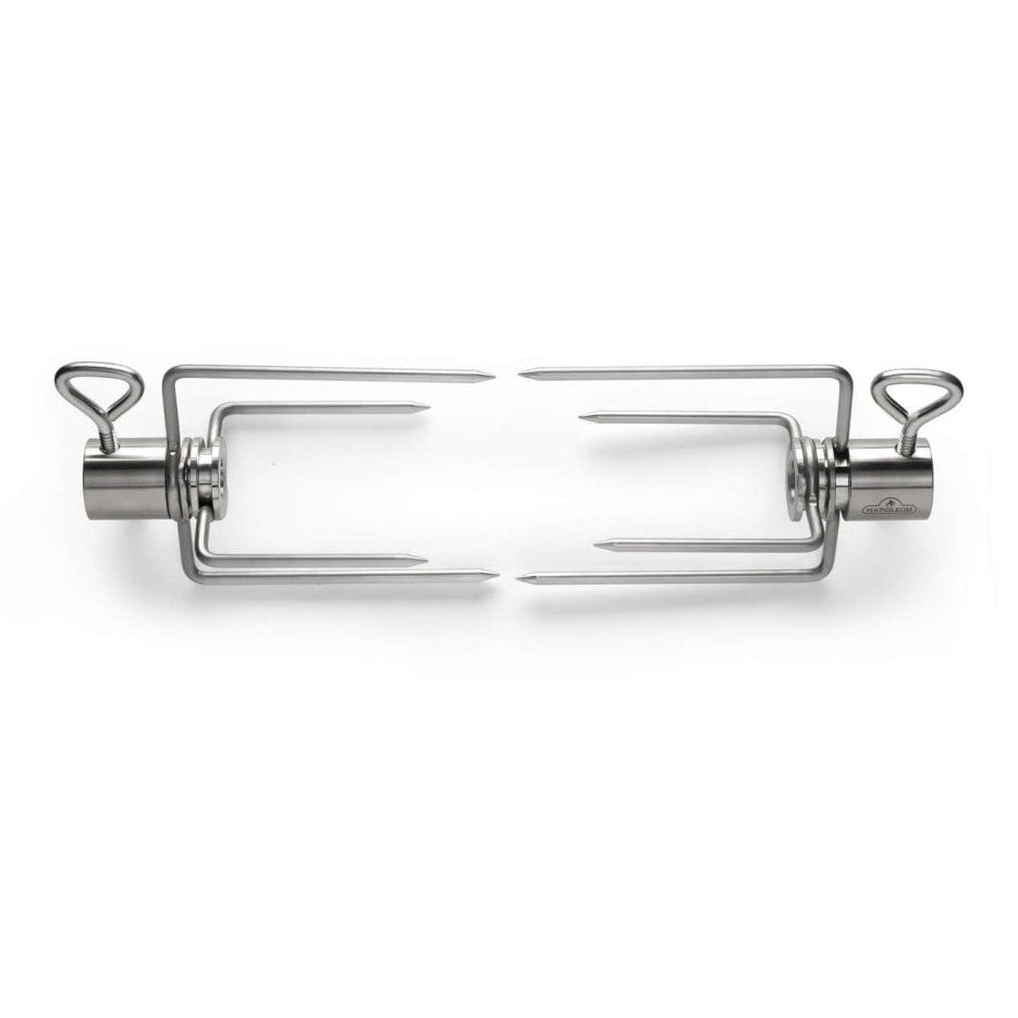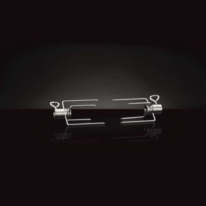 Using a rotisserie to create meals on the barbecue is easy and delicious, but sometimes you need a little extra help. This set of two Rotisserie Forks is happy to help. Featuring four prongs for easy gripping of food without damage and a collapsable design for easy storage, you won't know what you did before you had these extra hands. The food0-grade stainless steel is dishwasher safe and they are universal, fitting both square and hexagonal spit rods easily.