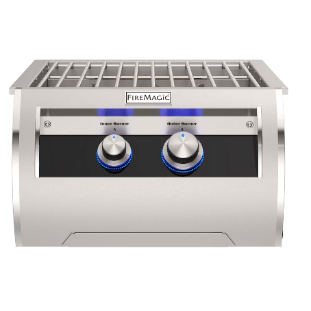 Fire Magic offers precision and performance in a small package with its line of side-cookers that, like their grills, are made in the USA. The versatile and powerful Echelon Diamond Power Burner is perfect for stock pots, woks, and more. The inner and outer natural gas ring burners combine for a total of 60,000 BTUs. The inner ring has a range of 3,000 to 15,000 BTUs, while the outer ring has a maximum of 45,000 BTUs. It features back-lit control knobs on elegantly designed black glass facing for modern style that matches its performance. Stainless Steel cooking grids are included as well as a stainless steel lid to protect the interior of the unit from the elements. This Power Burner hooks up to Fire Magic Echelon Diamond Series Grills or can be wired individually with using a separate power supply box (sold separately). The Echelon Diamond Power Burner is the perfect accessory for your luxury outdoor kitchen.