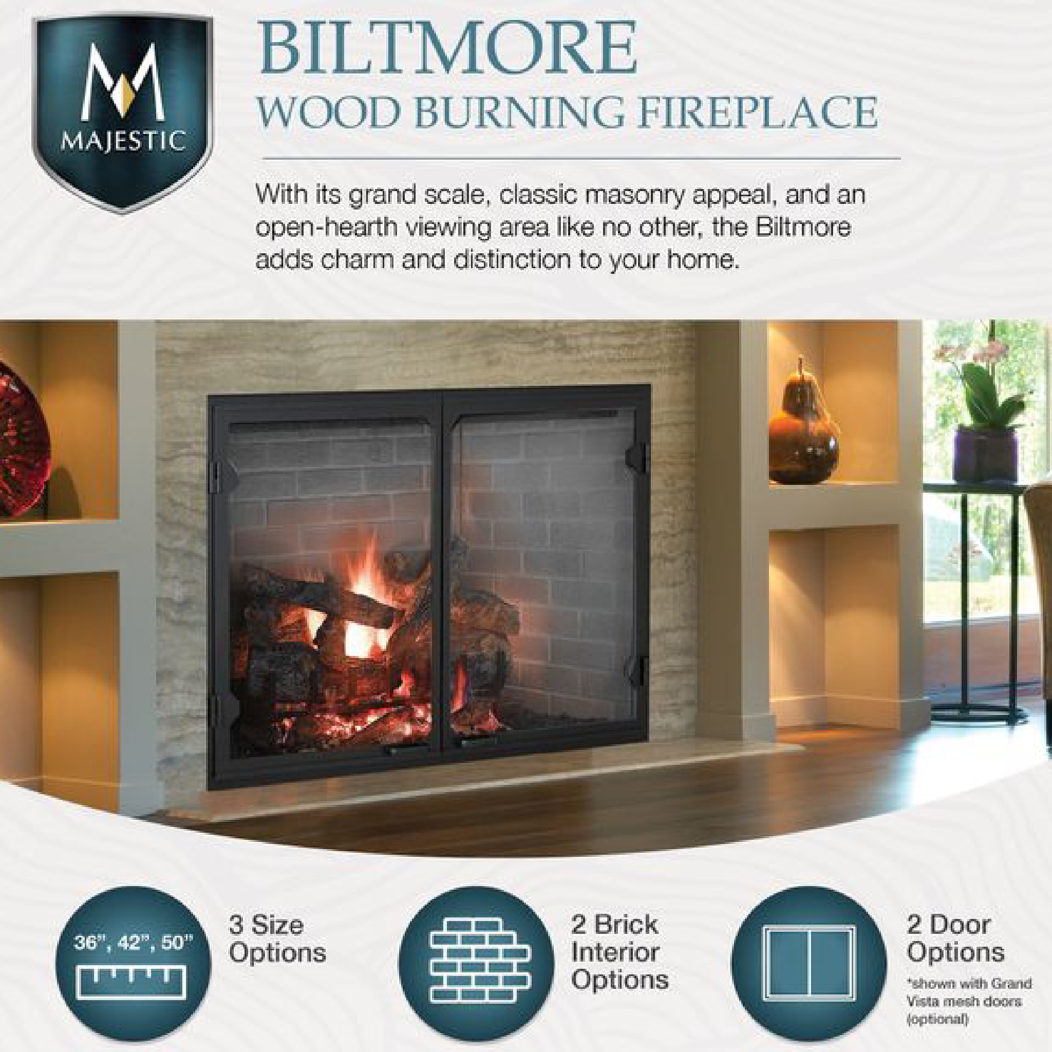 Equipped with two gas knockouts on either side of the firebox, the Biltmore allows you to easily convert from wood burning to Natural Gas or Liquid Propane fuels, and with up to 1,500 square inches of viewing area, friends and family can enjoy the lovely flame presentation from almost anywhere in the room! Bring classic style to your hearth today with the Majestic Biltmore Wood Burning Fireplace!