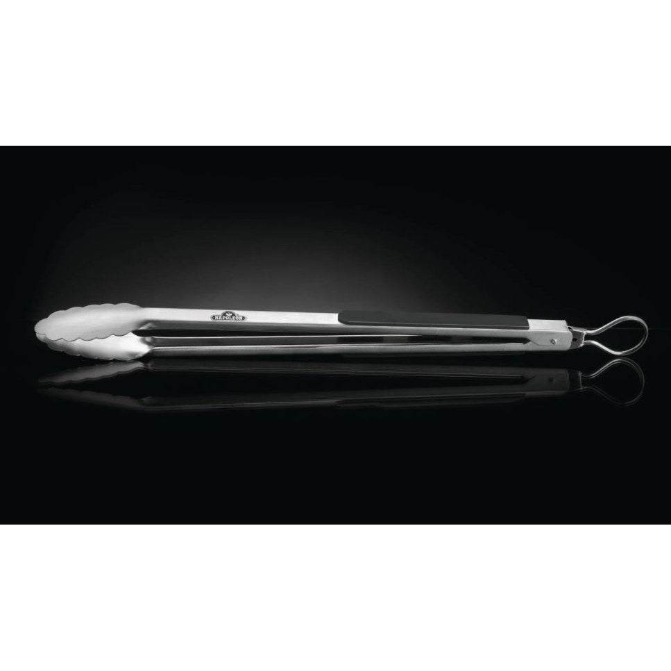 Grill enthusiasts around the globe say that the most important tool in their arsenal is a good set of tongs. And Napoleon's Stainless Steel Tongs are the best ones for the job. Starting with the perfect length, these tongs are not too short, nor too long. The rubberized grip inserts keep the tongs cool to the touch and give extra gripping power when in use. The 16-inches of stainless steel feel balanced and are easy to use in dainty hands or big strong ones. These Stainless Steel Tongs feature a sensitive spring action that allows them to be incredibly dexterous. Pick up a single pea with these tongs, or flip something larger than a two-pound steak. The scalloped ends grip food nicely without piercing the food and spilling the juices. Lock these tongs closed for easy storage. They fit in the kitchen drawer easily. Or hang them from the convenient loop.